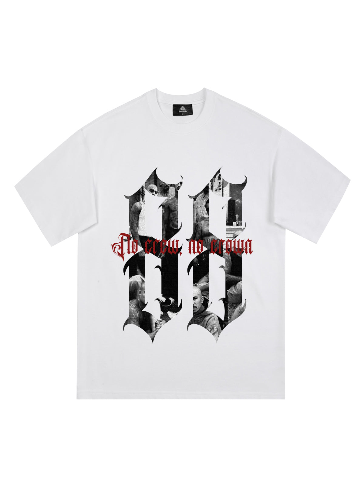 • Design Elements: Large graphic print featuring bold typography and photo collage, red text slogan "No crew, no crown"