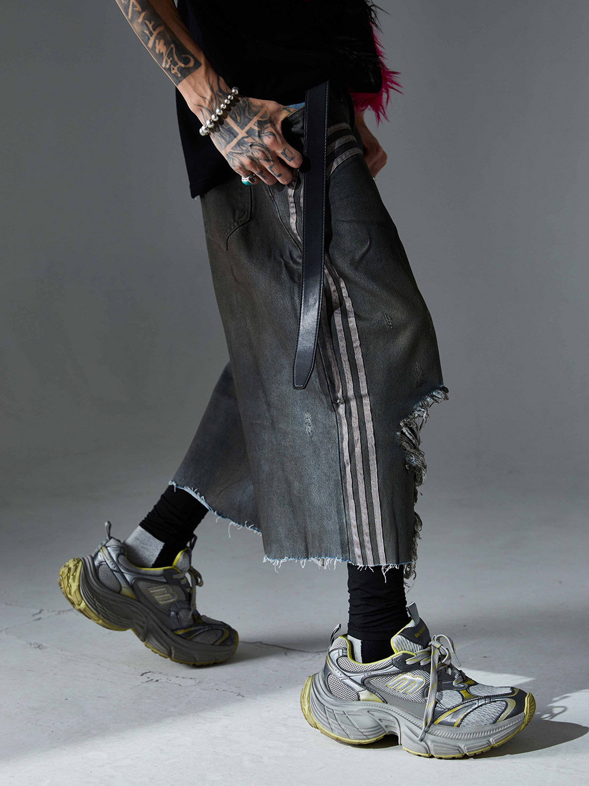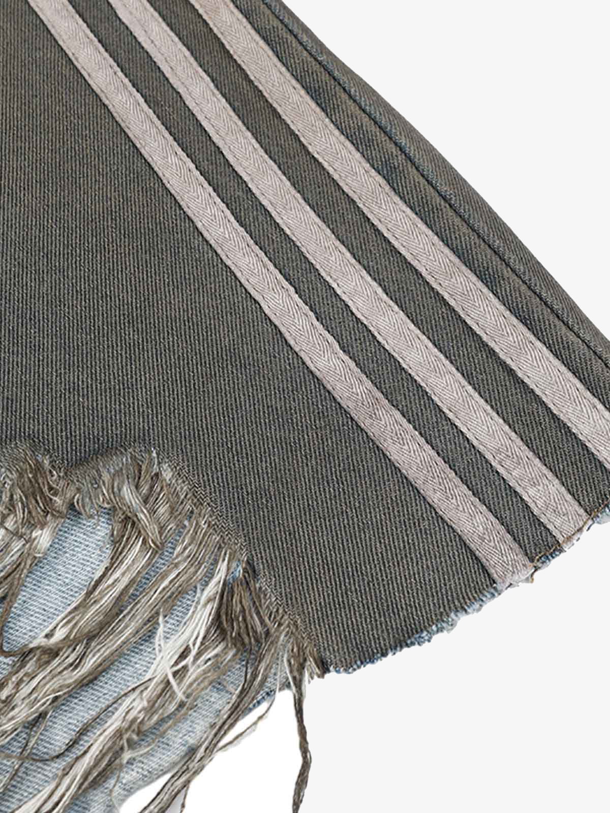 • Design Elements: Faded wash effect, striped detailing on the legs, button fly closure
